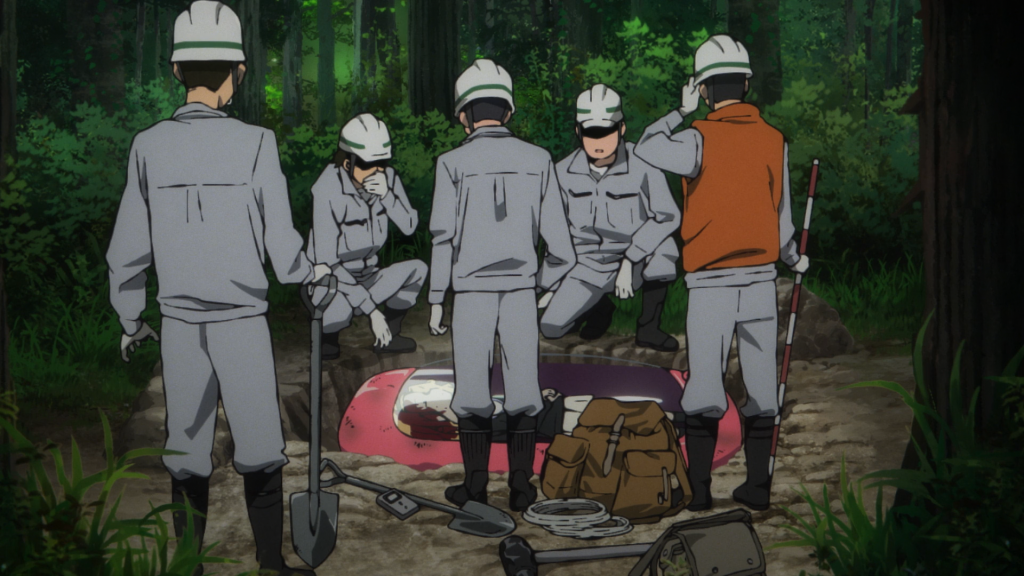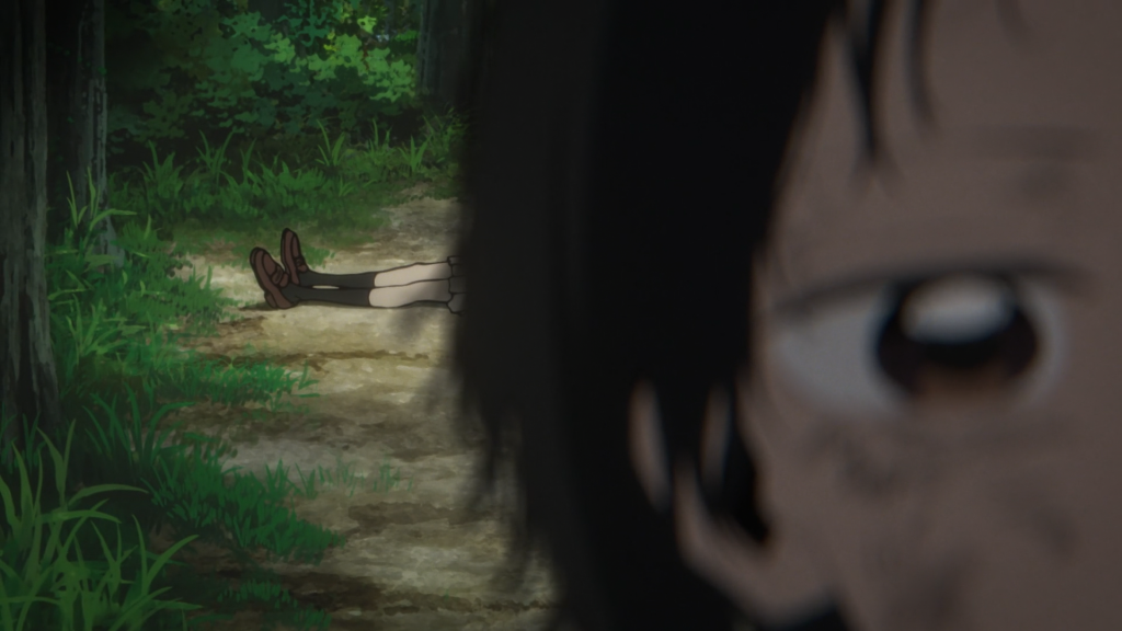 This episode was storyboarded and directed by Rikka, who I’m not very familiar with, at least not off the top of my head. But I really loved the POV shots she gave us. For example, when Azuma is talking to Shizuka about the murder, we first see them from a top-down view, with the leaves barely letting us see what’s going on. Then it switches to Azuma’s direct perspective, no longer allowing us to watch as detached outsiders. We become something else: witnesses to this crime. It’s not something we can look away from.